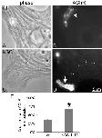 Figure 5. Blockage of tyrosine dephosphorylation of pre-patterned AChR clusters by NSC-treatment. R-BTX-labeled muscle cells were exposed to HB-GAM beads for 4 h in the absence (A-C) or presence of 1 μM NSC-87877 (D-F), fixed and then stained with anti-phosphotyrosine (mAb4G10) and FITC-conjugated secondary antibodies. In the example of the control muscle cell shown here, phosphotyrosine is detected at the bead-induced cluster (B, C; asterisks) but not at the pre-patterned cluster (B, C; arrow), but in the NSC-treated muscle cell, both the bead-induced cluster (E, F: asterisks) and the pre-patterned cluster (E, F: arrows) contain phosphotyrosine. G. Pooled data from multiple experiments were quantified after sorting the pre-patterned AChR clusters present on bead-stimulated cells as being fully tyrosine phosphorylated or partially or fully dephosphorylated. Control, n = 127; 0.1 μM NSC, n = 129; 1 μM NSC, n = 94; *p < 0.05 NSC relative to control.