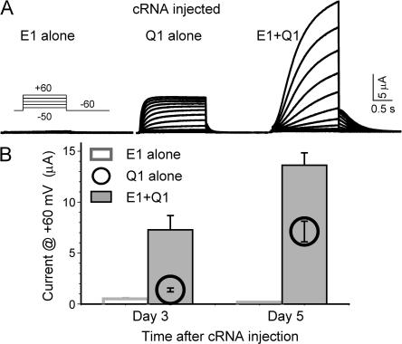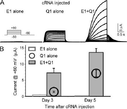 Figure 2. Validating the oocyte expression system for study of Q1/E1 interaction. Each oocyte is injected with cRNA for E1-WT alone (3 ng/oocyte, to monitor currents through oocyte endogenous xQ1 associated with E1-WT) (Sanguinetti et al., 1996), Q1-WT alone (10 ng/oocyte), or Q1-WT + E1-WT (10 and 3 ng per oocyte, respectively, cRNA molar ratio 1:1). Membrane currents are recorded on days 3 and 5 after cRNA injection. (A) Representative current traces elicited by the diagrammed protocol from oocytes injected with marked cRNA(s). (B) Mean current amplitudes at +60 mV from the three groups of oocytes. Note that the E1-alone currents are almost invisible at the same gain suitable for the other two groups, and the SE bar is buried in the line of the histogram bars. In all the experiments reported in this study, we inject the same amount of cRNA for Q1 and/or E1 variant per oocyte as listed above, including E1-WT alone, and currents are recorded on days 4â5 (unless otherwise noted). To quantify and compare current amplitudes in oocytes expressing Q1 plus E1 vs. Q1 alone, data from the former group are corrected for mean current amplitude of oocytes injected with E1-WT alone (representing contribution from oocyte xQ1/E1-WT in the same batch of oocytes). |