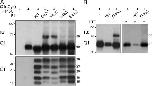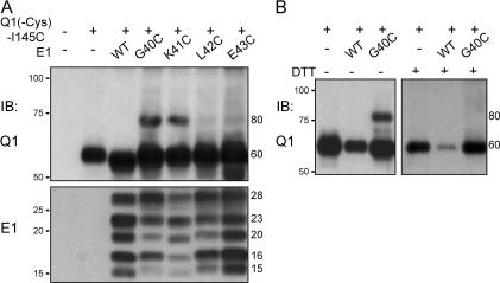 Figure 4. Testing disulfide bond formation between Q1 145C and Cys introduced into E1 positions 40–43. (A) COS-7 cells are transfected with cDNA(s) listed above (leftmost lane: no cDNA negative control). 48 h after transfection, cells are treated with NEM (to protect free thiol groups) followed by whole cell lysis and solubilization. Whole cell lysates are run on 7.5% and 14% nonreducing SDS gels. The former is probed for Q1 (with a V5 mAb targeting V5 epitope attached to the carboxyl end of Q1) and the latter is probed for E1 (with E1 pAb). Size marker positions are listed on the left, and sizes of Q1- or E1-specific bands are noted on the right (in kD). (B) Whole cell lysates prepared from COS-7 cells transfected with cDNA(s) listed above are each divided into two aliquots. One aliquot is treated with DTT (10 mM, room temperature, 10 min) while the other is incubated with buffer under the same conditions without DTT. All samples are run on a nonreducing SDS gel and probed for Q1 with V5 mAb. |