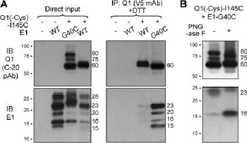 Figure 5. (A) Confirming the presence of E1 G40C in the 80- and 75-kD Q1-positive bands detected in whole cell lysate of COS-7 cells coexpressing Q1(-Cys)-I145C and E1-G40C. COS-7 cells are transfected with the cDNA(s) listed on top. An aliquot of the whole cell lysates is loaded onto the “direct input” lanes. The other aliquot is subjected to immunoprecipitation with V5 mAb. The immunoprecipitates are DTT treated and loaded onto the IP lanes. The Q1 and E1 are probed using a goat pAb against Q1 (C-20) and a rabbit pAb against E1. (B) Testing N-glycosylation in free E1 proteins and disulfide-linked Q1/E1 complex. Whole cell lysates from COS-7 cells coexpressing Q1(-Cys)-I145C and E1-G40C are treated with PNGase F or with buffer under the same conditions (“+” and “−” PNGase F) for 48 h at 37°C. The samples are fractionated by nonreducing SDS-PAGE and probed for Q1 and E1. |