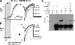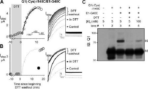 Figure 7. (A and B) Testing the state dependence of appearance of a constitutive component in oocytes expressing Q1(-Cys)-I145C/E1-G40C after DTT washout. Data from two experiments are shown, with time courses of appearance of the constitutive component (Istep) shown on the left, and superimposed current traces shown on the right. In both experiments, before DTT treatment, the oocytes manifest slowly activating currents without any constitutive component (dotted traces in right panels). The oocytes are exposed to DTT 10 mM for 10 min (gray shade, time axis breaks between start of DTT application and last few data points in DTT). In the presence of DTT, the current amplitudes increase but the currents remain slowly activating without a significant constitutive component (gray traces in the right panels). In A, during DTT washout the oocyte is repetitively pulsed from Vh −100 to +60 mV for 2 s, followed by a step to −60 mV for 2 s, once every minute (voltage clamp diagram in inset). The appearance of Istep follows a single exponential time course, with a time constant of 3.1 min (black thick curve superimposed on the open circle data points). In B, during DTT washout the oocyte is held at Vh −100 mV without pulsing for 15 min. The current induced by the first pulse after resuming pulsing is highlighted by the thick black current trace (right) and the small Istep component during the first pulse is highlighted by a solid black circle (left). The dotted curve is a scaled single exponential time course similar to that shown in Fig. 7 A. (C) Testing whether membrane depolarization by elevating [K]o facilitates disulfide bond formation between Q1 145C and E1 40C. COS-7 cells are transfected with cDNA(s) listed on the top two rows. Cells are incubated in medium containing 5 mM [K]o for 48 h. Cells in lanes 4 and 5 are treated with 10 mM DTT for 10 min to break disulfide bonds, followed by thorough rinsing to remove DTT. Cells in lane 4 are incubated in 5 mM [K]o medium, while cells in lane 5 are incubated in 100 mM [K]o medium for 10 min. All cell preparations are treated with NEM to protect free thiol groups, followed by whole cell lysis. Whole cell lysates are run on nonreducing SDS gel and probed for Q1 with V5 mAb. |
