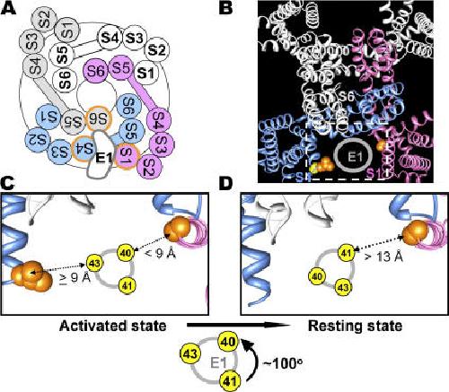 Figure 10. A structural model of E1 association with the Q1 channel, and dynamic interactions between the extracellular ends of their transmembrane domains. (A) Top view of the arrangement of transmembrane segments in a tetrameric Q1 channel based on the crystal structure of Kv1.2 (2A79.pdb). The four Q1 subunits are color coded light blue, pink, white, and light gray. S1–S4 of the voltage-sensing domains (VSDs), S5–S6 of the pore domains (PDs), and the S4–S5 linkers (rectangles connecting S4 and S5) are marked. The E1 transmembrane domain is in a putative “KCNE-binding pocket,” where E1 makes contacts with S4, S6, and S1 of three separate Q1 subunits. (B) Top view of a tetrameric Kv1.2 structure (using the 2A79.pdb coordinates), color coded in the same manner as in A. L290 at the extracellular end of S4 of the light blue subunit and UNK50 at the extracellular end of S1 of the pink subunit that serve as surrogates for A226 and I145 in Q1, respectively, are highlighted by the orange space-filled model. A291 at the extracellular end of S4 in the light blue Q1 subunit is also shown as yellow space-filled model. S6 of the light gray subunit is marked. The E1 transmembrane domain is signified by the open gray circle. The close-up view of the region demarcated by white dashed lines is shown in C and D. (C) In the activated state of the Q1/E1 channel complex, the E1 helix is oriented in such a manner that E1 position 40 faces toward Q1 position 145 (UNK50 in 2A79), and E1 position 43 faces toward Q1 position 226 of the adjacent subunit (L290 in 2A79). (D) Upon channel deactivation, the E1 helix is postulated to rotate ∼100° counterclockwise so that in the resting state E1 position 41 faces toward Q1 position 145. In C and D, the Cβ–Cβ distances are deduced by the rates of disulfide formation (Fig. 8 A and Fig. 9 A) (Nakajo and Kubo, 2007) and the experimentally determined relationship between the rate of disulfide formation and the distance between surface Cys pair (Careaga and Falke, 1992) (more in text). |