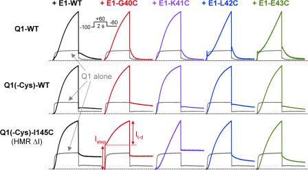 Figure 3. Q1 and E1 mutations investigated in this study preserve Q1 channel function and Q1/E1 interactions. Current traces are recorded from three batches of oocytes, expressing Q1-WT (top), Q1(-Cys)-WT (middle), or Q1(-Cys)-I145C (bottom), alone or with E1 WT or mutants at 1:1 cRNA molar ratio. The type of Q1 variant is marked on the left of each row, while the type of E1 variant is marked on the top of each column. In the case of Q1(-Cys)-I145C coexpressed with Cys-substituted E1 mutants, oocytes are treated with DTT (10 mM for 10 min, or 25 mM for 5 min) and thoroughly rinsed before current recording. The voltage clamp protocol is diagrammed in the inset of top row. To illustrate the effects of E1 variants on the channel function of each of the Q1 variants, in each row the same representative current trace recorded from an oocyte expressing respective Q1 variant alone is shown as a gray trace, superimposed with current traces from oocytes coexpressing E1 variants. To illustrate the current enhancing effects of E1 variants on the Q1 channels, the current traces are scaled to reflect the average ratio of current amplitudes of Q1+E1 vs. Q1 alone in the same batch of oocytes (the exact numbers of fold-increase in current amplitudes are listed in Table II). Q1(-Cys)-I145C coexpressed with E1-G40C manifests a unique time-independent component (Istep) and a time-dependent component (It-d). To ascertain that this is not due to interference from oocyte leak conductance, current traces in the third row are HMR-sensitive current (HMR ΔI = control current – current recorded in the presence of 10 uM HMR; Wu et al., 2006a). Dotted lines denote the zero current level. |