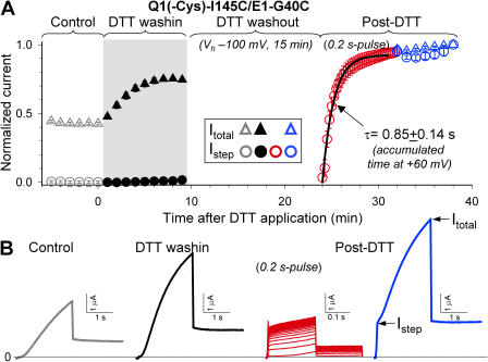 Figure 9. (A) Time course of changes in current amplitudes of Q1(-Cys)-I145C/E1-K41C before, during, and after DTT (10 mM) exposure. Data are averaged from six experiments. Oocyte membrane is pulsed from Vh −100 mV to +60 mV for 2 s, followed by repolarization to −60 mV for 2 s, once every 60 s. Current amplitudes at the end of the +60-mV step is measured and normalized by the control current before DTT exposure. The duration of DTT exposure is denoted by gray shade. The time course of current reduction after DTT washout is fit with a single exponential function (smooth curve superimposed on data points after DTT). The time constant (τ) is converted to cumulative time at Vh −100 mV (when channels are in the resting state). Mean and SEM values of τ are listed in inset. (B) Time course of changes in current amplitude of Q1(-Cys)-WT expressed alone before, during (gray shade), and after exposure to 10 mM DTT. Since there is no Cys in the Q1 channel, this experiment reveals a direct current-suppressing effect of DTT on the Q1 channel. The rapid onset of DTT effect and rapid/complete reversal reflect the time course of DTT equilibration in the bath solution during wash-in and rate of DTT clearance during washout. |