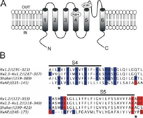 Figure 1. Comparison of amino acid sequence of Shaker and Kv1.2 in the region of the S4 and S5 segments. (A) A model describing the membrane topology of a Kv1.2 subunit showing transmembrane segments S1–S6 and the reentrant P loop. The approximate positions of residues R294 of S4 segment and A351 of the S5 pore domain are indicated. (B) Alignment of S4–S5 regions of Kv1.2, Shaker, KvAP, and the recently crystallized chimera of Kv1.2-Kv2.1. The black line indicates the S4 and S5 transmembrane segments and the asterisks denote the position of residues R294 and A351 of Kv1.2. Highlighted in blue and red are basic and acidic residues, respectively.