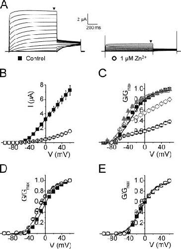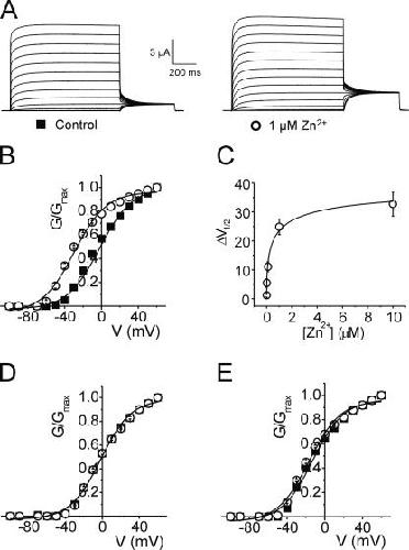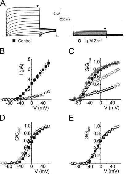Figure 4. Metal ion binding to R294H-A351H stabilizes the activated state after neutralization of acidic residues D352 and E353. (A) Representative current traces from an oocyte expressing Kv1.2-R294H-A351H-D352G-E353S channels recorded in the absence (left) and presence (right) of 1 μM Zn2+, using the protocol outlined in the Materials and methods. (B) Normalized G-V relationships from oocytes expressing Kv1.2-R294H-A351H-D352G-E353S channels recorded in the absence (solid squares, n = 9) and presence (open circles, n = 9) of 1 μM Zn2+. (C) A plot of ΔV1/2 versus Zn2+ concentration in oocytes expressing Kv1.2-R294H-A351H-D352G-E353S channels, where ΔV1/2 is the difference between the fitted V1/2 values obtained in the absence and presence of varying concentrations of Zn2+. The data were fitted with a hyperbolic function (solid curve) with a half-maximal concentration of 0.36 ± 0.18 μM (n = 4–8). (D and E) Normalized G-V curves obtained in the absence (solid squares) and presence (open circles) of 1 μM Zn2+ for (D) Kv1.2-R294H-D352G-E353S (n = 7) and (E) Kv1.2-A351H-D352G-E353S (n = 7).