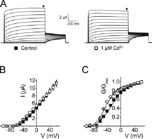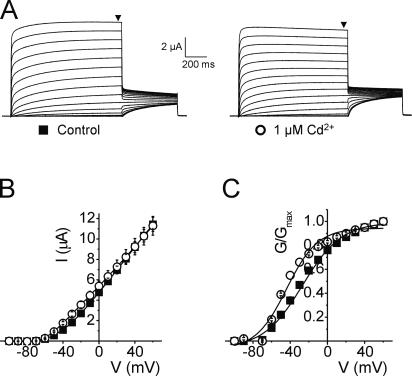 Figure 3. Cd2+ can form a metal bridge between R294H and A351H. (A) Representative current traces from an oocyte expressing Kv1.2-R294H-A351H channels recorded in the absence (left) and presence (right) of 1 μM Cd2+. Black arrowheads indicate where steady-state current was measured to generate I-V and G-V relationships. (B) Mean current–voltage relationships from oocytes expressing Kv1.2-R294H-A351H channels recorded in the absence (solid squares, n = 6) and presence (open circles, n = 6) of 1 μM Cd2+. (C) Normalized G-V relationships from oocytes expressing Kv1.2-R294H-A351H channels recorded in the absence (solid squares, n = 6) and presence (open circles, n = 6) of 1 μM Cd2+.
