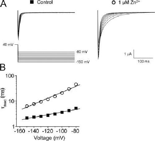Figure 5. Metal bridge formation slows channel closure signifying stabilization of the open-activated channel conformation. (A) Representative current traces from an oocyte expressing Kv1.2-R294H-A351H-D352G-E353S channels recorded in the absence (left) and presence (right) of 1 μM Zn2+. Bath solution contained 50 mM K+ in order to visualize inward tail currents. (B) Plot of time constant for deactivation versus voltage for channels recorded in the absence (solid squares) or presence (open circles) of 1 μM Zn2+ (n = 7 each). Tail currents were fitted with a single exponential and the time constant of deactivation (τ, ms) plotted on a log scale against voltage.