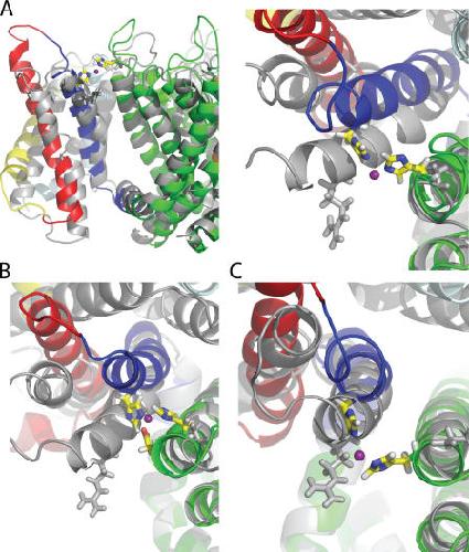 Figure 7. Comparison of the Kv1.2 crystal structure (Long et al., 2005) with instantaneous configurations taken from the MD simulations of the wild-type channel and mutant channels. (A) R294H-A351H-D352G-E353S (side and top view). (B) R294H-A351H (top view). (C) R294H-D352H (top view). Crystal structure is shown in gray. Mutant channel is represented as following: S1-cyan, S2-yellow, S3-red, S4-blue, pore-green, and Zn2+-violet. All the mutant structures were taken from the last snapshot of the MD trajectories. (See online supplemental material for the coordinates of the open activated Kv1.2 model obtained from R294H-A351H-D352G-E353S simulation in the presence of metal bridge).