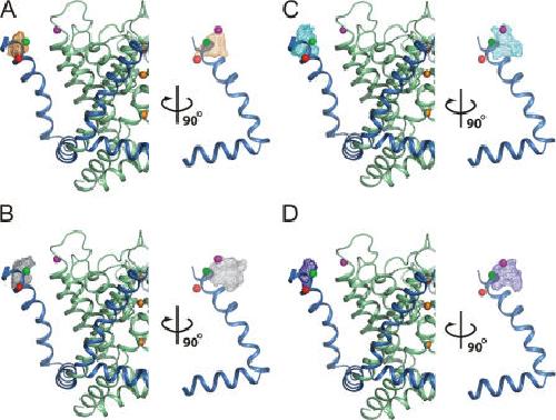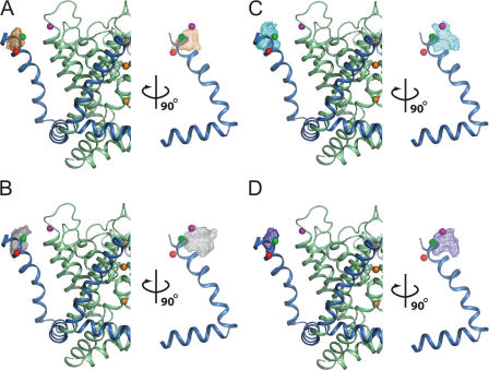 Figure 8. Position of the first gating charge along the S4 segment (R294) in the open-activated conformation of Kv1.2 channel deduced from MD. The mesh plots encompass the volume occupied 60% of the time by the Cβ of residue 294 during the different MD simulations. The data shown includes the wild-type Kv1.2 channel (A, orange mesh), the Kv1.2 channel with R294H-A351H Zn2+ bridge (B, gray mesh), the Kv1.2 channel with the R294H-D352H Zn2+ bridge (C, cyan mesh), and the Kv1.2 channel with the R294H-D352H Zn2+ bridge and the substitution D352G-E353S (D, blue mesh). On the left is a side view from membrane and on the right is a side view from the pore. As a reference, the S4 segment (sky blue ribbon) and the pore domain (pale green ribbon) from the crystal structure of the Kv1.2 channel (PDB id 2A79) are shown. Three K+ ions are shown in the pore as orange spheres (left). The Cβ of residue 294 and the Cβ of residue 351 from the Kv1.2 x-ray structure are shown as red and magenta spheres, respectively. The Cβ of the residue at the corresponding position in the x-ray structure of the Kv1.2-Kv2.1 chimera PDB id 2R9R (Q290) is shown as a green sphere (assuming the same position for the pore domain). To record the probability density of the Cβ of residue 294 from the MD, the pore domain (S5–S6) was oriented with respect to the x-ray structure for every snapshot, followed by increments of 90° rotations to superimpose the voltage sensor modules of the four subunits (Jogini and Roux, 2007), yielding four data points per snapshot. For the wild-type channel, one snapshot every 5 ps is included (total 20,000 points), for each mutant one snapshot every 2 ps from two trajectories is included (total 10,000 points).