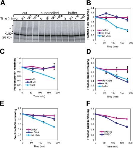 Figure 2. DSBs lead to the proteasomal degradation of Ku80. (A) Cut linear DNA, supercoiled circular DNA, or buffer was added to extract containing 35S-labeled Ku80. After incubation at 22°C for the indicated times, samples were taken. The asterisk indicates DSB-dependent modified Ku80. Radioactively labeled protein was visualized using a phosphorimager. (B) Quantification of the radioactivity of the entire lane in A using a phosphorimager (n = 4). (C) Degradation, quantified as in B, of Ku80, Ku70, and Mre11 in the presence of cut DNA (n = 3). (D) Degradation, quantified as in B, of Ku80 in the presence of cut DNA and buffer, 0.5 mg/ml wild-type ubiquitin, or 0.5 mg/ml ubiquitin-K48R (n = 3). (E) Degradation of Ku80 in the presence of buffer, supercoiled DNA, or cut DNA. At indicated time points extract samples were spotted onto glass microfiber filters and precipitated in 10% TCA, and radioactivity was quantified using a liquid scintillation counter (n = 4). (F) Degradation, quantified as in E, of Ku80 in the presence of either DMSO or 100 μM MG132 (n = 4). Error bars denote one standard error of the mean. |