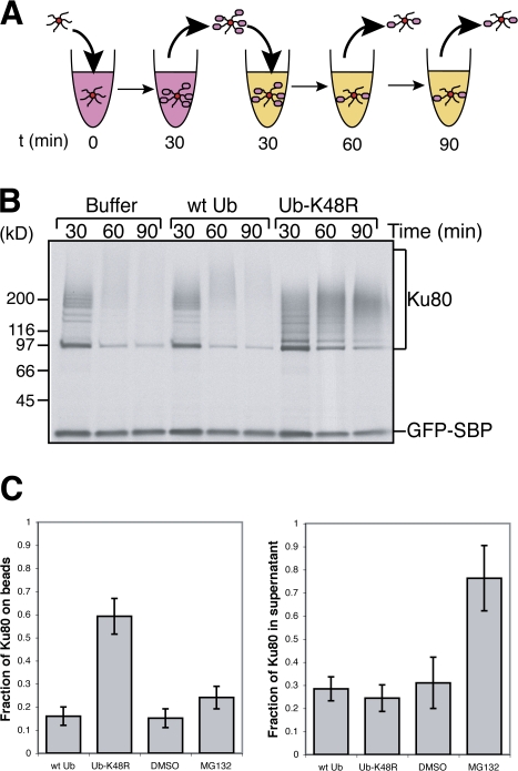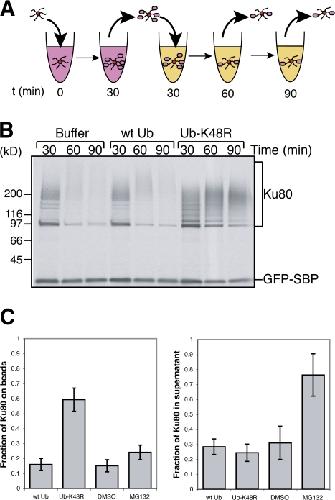Figure 3. Polyubiquitylation induces the loss of Ku80 from DNA. (A) The experimental scheme of the release assay. At time 0, SB-DNA beads and streptavidin-coated beads were added to egg extract containing 35S-labeled Ku80 and either ubiquitin storage buffer, 0.5 mg/ml ubiquitin, 0.5 mg/ml ubiquitin-K48R, DMSO, or 100 μM MG132. Beads were incubated for 30 min, removed from the extract, and subsequently washed and incubated in extract containing the additional factors but lacking the radioactive proteins for an additional 30 or 60 min. As a control for bead recovery, we used the streptavidin beads coated with 35S-labeled GFP fused to the streptavidin-binding peptide (GFP-SBP). (B) The results of the experiment described in A after exposure to film. Extract contained buffer, 0.5 mg/ml ubiquitin, or 0.5 mg/ml ubiquitin-K48R. Polyubiquitylated Ku80 and GFP-SBP, added as a recovery control, are indicated. (C) Extract contained buffer, 0.5 mg/ml ubiquitin, 0.5 mg/ml ubiquitin-K48R, DMSO, or 100 μM MG132. Beads isolated after 30 min in extract containing radioactive Ku80 (t = 30 min), along with beads chased for an additional 30 min in nonlabeled extract (t = 60 min), were washed, and retained radioactivity was quantified using a liquid scintillation counter. In addition, samples were taken from the supernatant of the 60-min time point and precipitated onto glass microfiber filters with 10% TCA, and radioactivity was quantified using a liquid scintillation counter. The values of Ku80 remaining on beads and Ku80 in supernatant at t = 60 min were normalized relative to the radioactivity on beads at t = 30 min for each sample. Error bars denote one standard error of the mean; n = 3. |