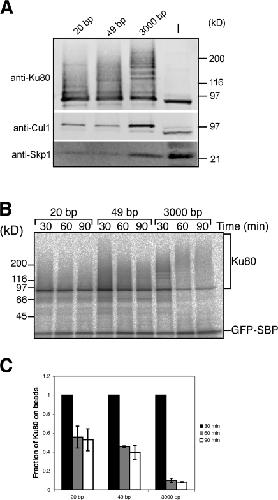 Figure 4. Ku80 bound to short oligonucleotide duplexes has less polyubiquitylation and is stable on DNA beads. (A) Steptavidin-coated beads bound to a biotinylated hairpin-containing 20-bp duplex DNA, a 49-bp double-stranded oligo containing a biotinylated 3′ end on one strand, or a 3,000-bp SB-DNA were incubated in extract for 30 min. Binding of Ku80, Cul1, and Skp1 were analyzed by immunoblot. (B) 20- and 49-bp oligo DNA beads and SB-DNA beads were used in the DNA release assay detailed in Fig. 3 A. (C) Quantification of B using a phosphorimager. Error bars denote the range of the data; n = 2. |