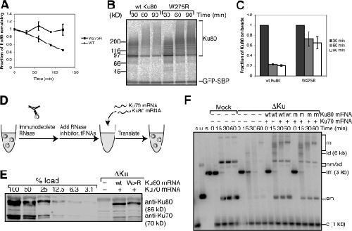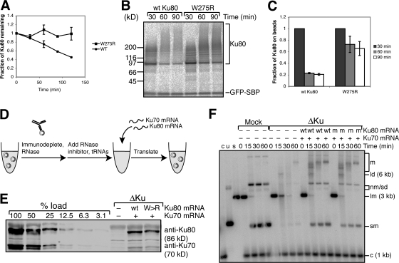 Figure 6. Ku80-W275R is functional for NHEJ but is not released from DNA. (A) Radioactively labeled wild-type (WT) Ku80 or Ku80-W275R were mixed with egg extract and linear DNA was added. Samples were taken at the indicated time points, and degradation was quantified using a phosphorimager. Error bars denote the range of data; n = 2. (B) Wild-type Ku80 and Ku80-W275R were used in the release assay (Fig. 3 A), and the results were visualized using a phosphorimager. (C) Quantification of results in B, including modified and unmodified Ku80. Error bars denote the range of data; n = 2. (D) Schematic of immunodepletion/translation experiment. Extract was immunodepleted using an anti-Ku80 antibody in the presence of RNase A, after which an RNase inhibitor was added along with tRNAs. mRNAs encoding Ku70 and either wild-type or mutant Ku80 were then added and allowed to translate in the extract. (E) Samples of extract after translation were immunoblotted and probed with antibodies against Ku70 and Ku80. For comparison, a dilution series of undepleted extract has been included. (F) After translation, Xmn1-digested pBluescript SK+ DNA was added to the extract. At indicated time points, samples were taken and treated with proteinase K and phenol/chloroform extraction. DNA was run on an agarose gel containing ethidium bromide, Southern blotted, probed with pBluescript DNA, and exposed to film. s, linear substrate; c, internal 1-kb control; u, uncut plasmid; sm, supercoiled monomer; lm, linear monomer; nm/sd, nicked monomer/supercoiled dimer; ld, linear dimer; m, higher order multimers. |