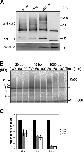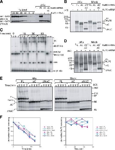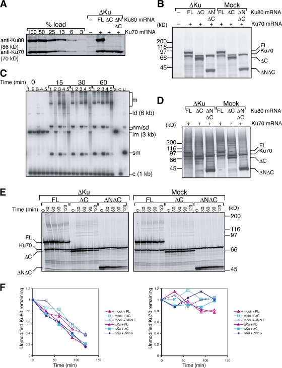 Figure 7. Nonfunctional Ku80 is ubiquitylated and degraded in response to DSBs. NHEJ, DNA binding, and degradation of Ku80 using Ku-depleted (ÎKu) extract complemented with full-length or truncated Ku80 and Ku70. After mock or Ku depletion and RNase treatment, mRNAs encoding Ku70 and either full-length Ku80, Ku801-543 (ÎC), or Ku80183-543 (ÎNÎC) were translated in the extract. 35S-methionine was added as indicated to radioactively label the translated proteins. (A) Extracts were immunoblotted with antibodies against Ku80 and Ku70. C-terminally truncated Ku80 cannot be detected with the anti-Ku80 antibody. (B) Autoradiograph of extracts labeled with 35S-methionine visualizing the C-terminally truncated Ku80 as well full-length Ku80 and Ku70. (C) NHEJ assay. Xmn1-digested pBluescript SK+ was added to mock- or Ku-depleted extracts after translation. At time points indicated, samples were removed, and DNA was purified by proteinase K digestion and phenol extraction. The resulting Southern blot was probed with pBluescript SK+ and exposed to film. Lanes 1, mock-depleted extract; lanes 2, ÎKu extract; lanes 3, ÎKu extract + Ku80 + Ku70; lanes 4, ÎKu extract + Ku80 ÎC + Ku70; lanes 5, ÎKu extract + Ku80 ÎNÎC + Ku70. s, linear substrate; c, internal 1-kb control; u, uncut plasmid; sm, supercoiled monomer; lm, linear monomer; nm/sd, nicked monomer/supercoiled dimer; ld, linear dimer; m, higher order multimers. (D) Autoradiograph of labeled proteins copurified with SB-DNA beads, revealing the binding of Ku80 truncations to SB-DNA beads and their modifications. (E) Degradation assay. Xmn1-digested pBluescript SK+ was added to extracts after translation in the presence of 35S-methionine. Autoradiograph of extract samples taken at the indicated time points is shown. (F) Quantification of results in E, using a phosphorimager. Left, loss of Ku80 (unmodified band); right, Ku70. |