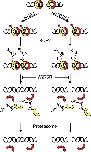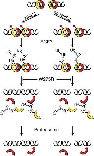 Figure 8. A model for Ku removal from DNA. Ku70 (red) and Ku80 (yellow) form a ring that encircles a DSB. The heterodimer either recruits other NHEJ proteins, repairing the break (left), or fails to do so (right). Binding to DNA causes Ku to become posttranslationally modified, possibly through phosphorylation (pink boxes). An E3 ubiquitin ligase such as the SCF complex recognizes this modification and polyubiquitylates Ku80. This leads to dissociation from DNA, which is inhibited by the W275R mutation. Dissociation is followed by proteasomal degradation. |