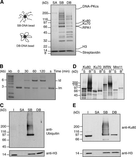 Figure 1. Polyubiquitylation and Ku80 modification at DSBs. (A) Streptavidin-coated, SB-DNA, and DB-DNA beads were incubated in egg extract for 30 min, and bound proteins were visualized with colloidal coomassie stain. A similar gel was analyzed by ms/ms, and some proteins identified are indicated. SA, streptavidin beads; SB, SB-DNA beads; DB, DB-DNA beads. (B) After SB-DNA beads were incubated in egg extract for the indicated times, DNA was purified and visualized by ethidium bromide. kb, 1-kb ladder; lm, linear monomer; ld, linear dimer; s, substrate DNA. (C) Proteins coisolated with streptavidin-coated, SB-DNA, and DB-DNA beads after 45-min incubation in egg extract were immunoblotted with antibodies against ubiquitin and histone H3 as a control. I, extract input; SA, streptavidin beads; SB, SB-DNA beads; DB, DB-DNA beads. (D) 35S-methionine–labeled Ku80, Ku70, WRN, or Mre11 were mixed with extract in which SB-DNA beads were incubated for 45 min and visualized by exposure to film. S, supernatant; B, beads. (E) As in C, except the proteins were immunoblotted with antibodies against Ku80 and histone H3. |