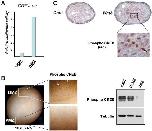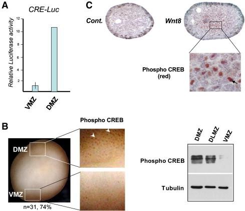 Fig. 1. A gradient of phospho CREB along the dorsalâventral axis of the marginal zone. (A) Embryos (n = 18) were injected with the pTal-CRE-Luc reporter gene. VMZ and DMZ explants were cultured until sibling embryos reached stage 15. Proteins were extracted and used to assay luciferase activity. The values are the average of three experiments. (B) Left panel: Albino embryos (n = 31) at stage 10.25 were stained with primary antibody to phospho CREB, and a streptavidinâperoxidase conjugate secondary antibody. White arrowheads point at nuclear staining. Right panel: DMZ, DLMZ and VMZ explants (n = 18) were isolated at stage 10.25, proteins were extracted and analyzed by Western blotting using anti phospho CREB and anti tubulin antibodies. (C) Transcripts of wnt8 (500 pg) were injected into one cell embryos (n = 3). Animal cap explants were isolated (Stage 8.5). AC explants were fixed at late gastrula, sectioned and immunostained with antibodies to phospho CREB.