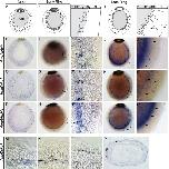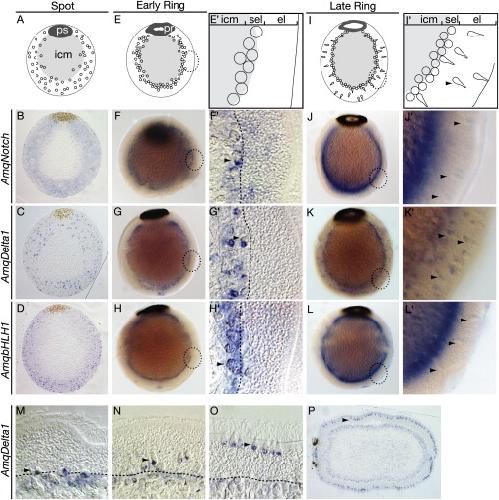 Figure 1. Neurogenic Gene Expression in Amphimedon queenslandicaWhole-mount in situ hybridizations with probes for AmqNotch, AmqDelta1, and AmqbHLH1. (A), (E), (Eâ²), (I), and (Iâ²), top row, show cartoons of sponge development, anterior down. (F)â(H) and (J)â(L) show whole-mount in situ hybridizations. (B)â(D), (Fâ²)â(Hâ²), and (M)â(O) show sectioned in situ hybridizations. (Fâ²)â(Hâ²) and (Iâ²)â(Lâ²) show magnification of dotted circles in (F)â(H) and (I)â(L), respectively. In spot-stage embryos, all genes are expressed in the outer layer (BâD). As ring formation proceeds, the expression of all genes coalesces in the subepithelial layer (FâH) and is found in the large, round pre-migratory globular cells (indicated by arrowheads in (Fâ²)â(Hâ²); see also Figure S1). In late-ring-stage embryos, globular cells (indicated by arrowheads) migrating away from the subepithelial layer strongly express AmqDelta1 (K), whereas expression of AmqNotch (J) and AmqbHLH1 (L) remains more highly expressed in the subepithelium. The migration of globular cells originating in the subepithelial layer of ring-stage embryos (M) and their intercalation into the epithelial layer of larvae (P) is visualized by AmqDelta1 expression (MâP). Arrowheads indicate globular cells; dashed lines indicate subepithelial-epithelial layer boundary. The following abbreviations are used: ps, pigment spot; pr, pigment ring, icm, inner cell mass; sel, subepithelial layer; and el, epithelial layer.