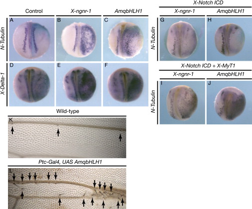 Figure 2. AmqbHLH1 Has Neurogenin-like Proneural Activity in Xenopus and Atonal-like Proneural Activity in Drosophila(AâF) X-ngnr-1 or AmqbHLH1 mRNAs were injected, together with lacZ mRNAs, into one cell of two-cell-stage Xenopus embryos and analyzed by in situ hybridization. Probes are indicated on the left of the pictures. Injections of lacZ mRNA alone were used as controls. Dorsal views of neurula-stage embryos with the injected side on the right visualized by the light-blue staining that corresponds to lacZ expression are shown.(GâJ) Dorsal views of N-Tubulin-labeled neurula-stage embryos that have been injected with X-ngnr-1 (left pictures) or AmqbHLH1 (right pictures) mRNAs in combination with X-NotchICD (G and H) or X-Notch ICD + X-MyT1 (I and J). The injected side is on the right.(KâL) Dorsal views of the central part (vein III-vein IV region) of the wing of wild-type (K) and Ptc-Gal4, UAS-AmqbHLH1 (L) flies. In wild-type, only three sensilla are found on vein III (indicated by arrows in [K]). AmqbHLH1 induces the formation of many sensory organs (indicated by arrows in [L]) as well as abnormal vein/intervein formation (see Figure S7 for more details).