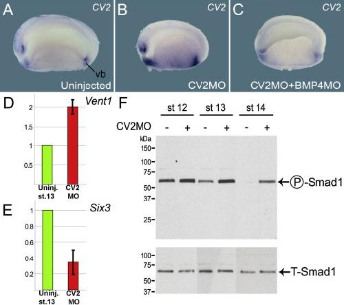 Figure 1. CV2 Is a Secreted BMP Feedback Inhibitor(A) Normal CV2 expression at stage 22 (hemisection). vb, ventral blastopore.(B) CV2MO microinjection increases CV2 expression.(C) The CV2 negative feedback loop requires BMP4. For each experimental sample, at least 25 embryos were examined, with similar results.(D) qRT-PCR showing increased expression of the ventral marker Vent1 in CV2-depleted embryos.(E) CV2 depletion reduces expression of the dorsal/forebrain marker Six3.(F) Endogenous Smad1 phosphorylation is increased by CV2 depletion at gastrula and neurula stages 12, 13, and 14. A pSmad1 signal was detectable in the stage 14 uninjected lane upon longer exposure. Total Smad1 antibody (T-Smad1) staining was used as loading control. |