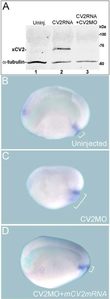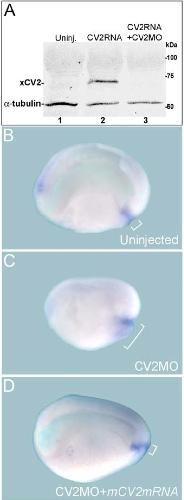 Figure S4. The CV2 MO Is Effective and Can Be Rescued by mCV2 mRNA. (A) CV2 MO inhibits the translation of microinjected Xenopus CV2 mRNA. Embryos were injected four times with 250 pg of mRNA with or without CV2 MO, harvested at stage 13 and analyzed by Western blot using α-tubulin (1:2000, Calbiochem) as loading control. The novel anti-xCV2 antibody used here (1:2000 dilution) was generated in rabbit (Covance) from a synthetic peptide encoding the amino-terminal sequence of Xenopus CV2 (SSFLTGSIAKAENEGEALQIPFITDNPC). (B) Hemisected embryo stained with CV2. (C) Expansion of the ventral CV2 domain after CV2 MO radial injection. (D) Mouse CV2 mRNA (Coffinier et al., 2002) prevents the effect of CV2 MO. The white brackets indicate the width of the CV2 domain around the ventral blastopore. |