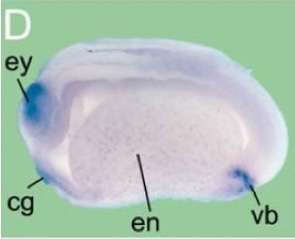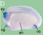 bmper (BMP binding endothelial regulator) gene expression in a hemisected Xenopus laevis embryo, assayed via in situ hybridization, NF stage 21, anterior left, dorsal up. Key: cg= cement bland; en= endoderm; vb= ventral blastopore region |