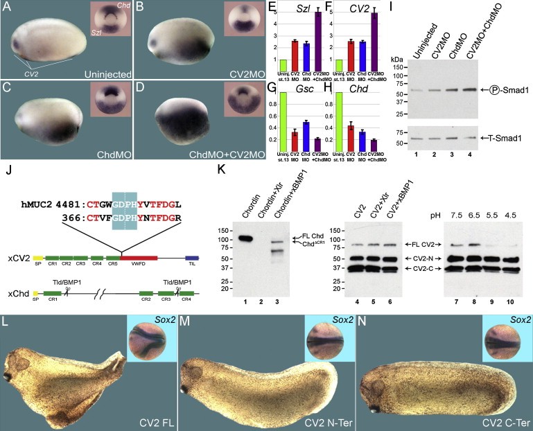 Figure 2. CV2 and Chordin Compensate for Each Other in Xenopus D-V Patterning(A) Uninjected embryo showing CV2 expression, which is used here as a BMP4 signaling readout (n = 17). Inset shows mid-gastrula embryo stained for Chordin (Chd) and Sizzled (Szl) (n = 24).(B) CV2 depletion upregulates its own expression (n = 15), as well as increasing Szl and decreasing Chd (n = 20).(C) Depletion of the BMP antagonist Chordin also increases the ventral CV2 and Szl expression domains (n = 13 and n = 18, respectively).(D) When coinjected, CV2 MO and Chd MO show a marked expansion of the CV2 and Szl expression domains (n = 15 and n = 25, respectively).(EâH) qRT-PCR analyses of single and double CV2 and Chd morphants for the D-V markers Szl, CV2, Gsc, and Chd at late gastrula stage 12.5.(I) Endogenous Smad1 phosphorylation is increased by coinjection of Chd MO and CV2 MO in stage 11 embryos.(J) The CV2 cleavage sequence contains the conserved low-pH GDPH autocatalytic site present in mucins. hMuc2, human mucin-2.(K) Chordin, but not full-length CV2, is cleaved by the extracellular zinc-metalloproteinases Xolloid-related (Xlr) and BMP1 (lanes 1â6). However, cleavage of full-length CV2 (80 kD band) is triggered by low pH (lanes 9 and 10).(LâN) Ventral injections of mRNAs encoding full-length CV2 (CV2-FL, n = 56, of which 95% had partial secondary axes, three independent experiments), N-terminal CV2 fragment terminating at the GDPH cleavage site (CV2 N-Ter, n = 42, no secondary axes observed), or a secreted C-terminal fragment encoding most of the vWFd domain (CV2 C-Ter, n = 45, no secondary axes observed). The insets show injected embryos at late neurula stage hybridized with the panneural marker Sox2. |