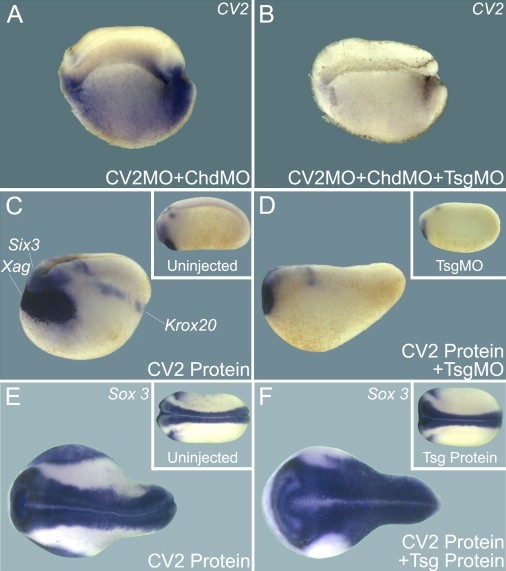 Figure 3. Twisted-Gastrulation Is Required for the Effects of CV2 Loss of Function and Overexpression(A) Simultaneous depletion of CV2 and Chordin strikingly increased CV2 expression, reflecting increased BMP signaling (see Figure S5 for controls).(B) The effects of CV2 MO and Chd MO require Twisted-Gastrulation (Tsg) activity (pro-BMP effect of Tsg).(C) CV2 protein injection into the blastula cavity induces strong dorsalization of the Xenopus embryo, as indicated by the expansion of the dorsal markers Xag1, Six3, and Krox20 (n = 12, all strongly dorsalized). Inset shows an uninjected embryo.(D) CV2 protein requires endogenous Tsg for its anti-BMP activity (n = 10, all embryos similarly affected). Inset shows Tsg MO-injected embryo.(E) CV2 protein injection expands the neural tube (n = 17). Inset shows uninjected embryo.(F) Tsg and CV2 protein coinjection renders CV2 a stronger BMP antagonist, expanding the nervous system marked by Sox3 (n = 16, all coinjected embryos were more dorsalized than those injected with CV2 protein alone despite some individual variations). Inset shows embryo injected with Tsg protein alone. |