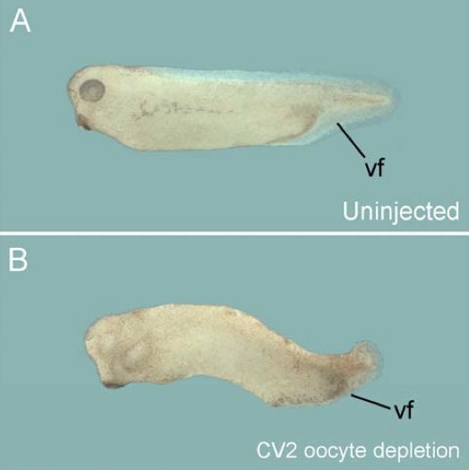 Figure S2. Maternal Injection of CV2 MO into Xenopus tropicalis Oocytes (A) Uninjected embryo at stage 33. (B) The CV2 MO oocyte injection phenotype does not differ from the one obtained when embryos are injected at 2-cell stage. Note the reduction in the ventral fin (vf), which indicates a pro-BMP function for endogenous CV2. This experiment indicates that there is no significant maternal contribution to the CV2 phenotype in Xenopus. |