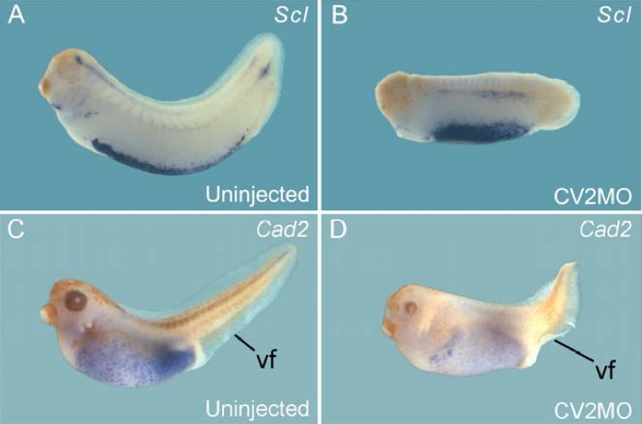 Figure S3. CV2 Knockdown Affects D-V Patterning in the Mesoderm and the Endoderm. (A-B) Embryos stained with the blood island marker Scl (Stem cell leukemia). CV2 depletion increases staining in the blood island indicating an increase in BMP signaling. (C-D) In situ hybridization using the endodermal marker Cad2. CV2 depletion severely affects endoderm formation. Note that the ventral fin (vf) is decreased in size. |