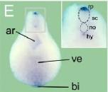 bmper (BMP binding endothelial regulator) gene expression in a transverse section of a Xenopus laevis embryo, assayed via in situ hybridization, NF stage 28, dorsal up. Key: ar: archenteron; ve= ventral endoderm; bi= ventral blood island; rp= roof plate, no= botochord; hy= hypochord; sc= spinal cord. |