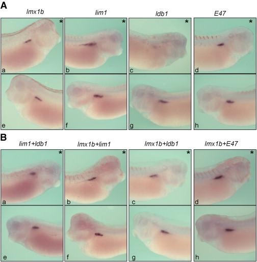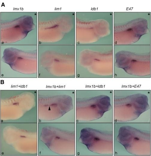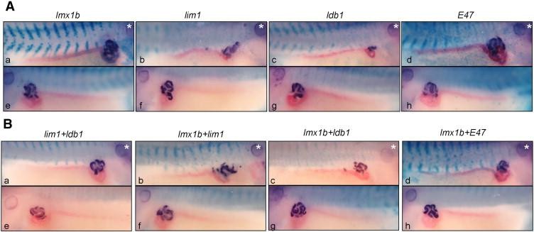 Fig. 5. Over-expression of lmx1b and its potential binding partners affects wt1 expression. mRNAs of lmx1b and its potential binding partners were injected either alone (panel A) or in combination (panel B), together with lacZ, into one V2 blastomere at the 8-cell stage. Red Gal staining followed by wt1 in situ hybridisation was carried out at stage 35/36 in order to assess any glomus phenotype. For each embryo, the injected side (indicated by an asterisk, panels aâd) was compared to the uninjected side (panels eâh). Injection of lmx1b mRNA alone did not induce any significant glomus phenotype (A, compare panel a to e), whereas injection of lim1 or ldb1 alone, its potential binding partners, resulted in the formation of an enlarged and reduced glomus respectively (A, b and f; A, c and g). These phenotypes can be partially rescued by the co-injection of lmx1b (B, b, arrowhead and f; B, c and g). Interestingly, co-injection of lim1 and ldb1 rescued both phenotypes, resulting in the formation of a more normal glomus (B, a and e). Injection of E47 alone or in combination with lmx1b did not induce any statistically significant phenotype (A, d and h and B, d and h).