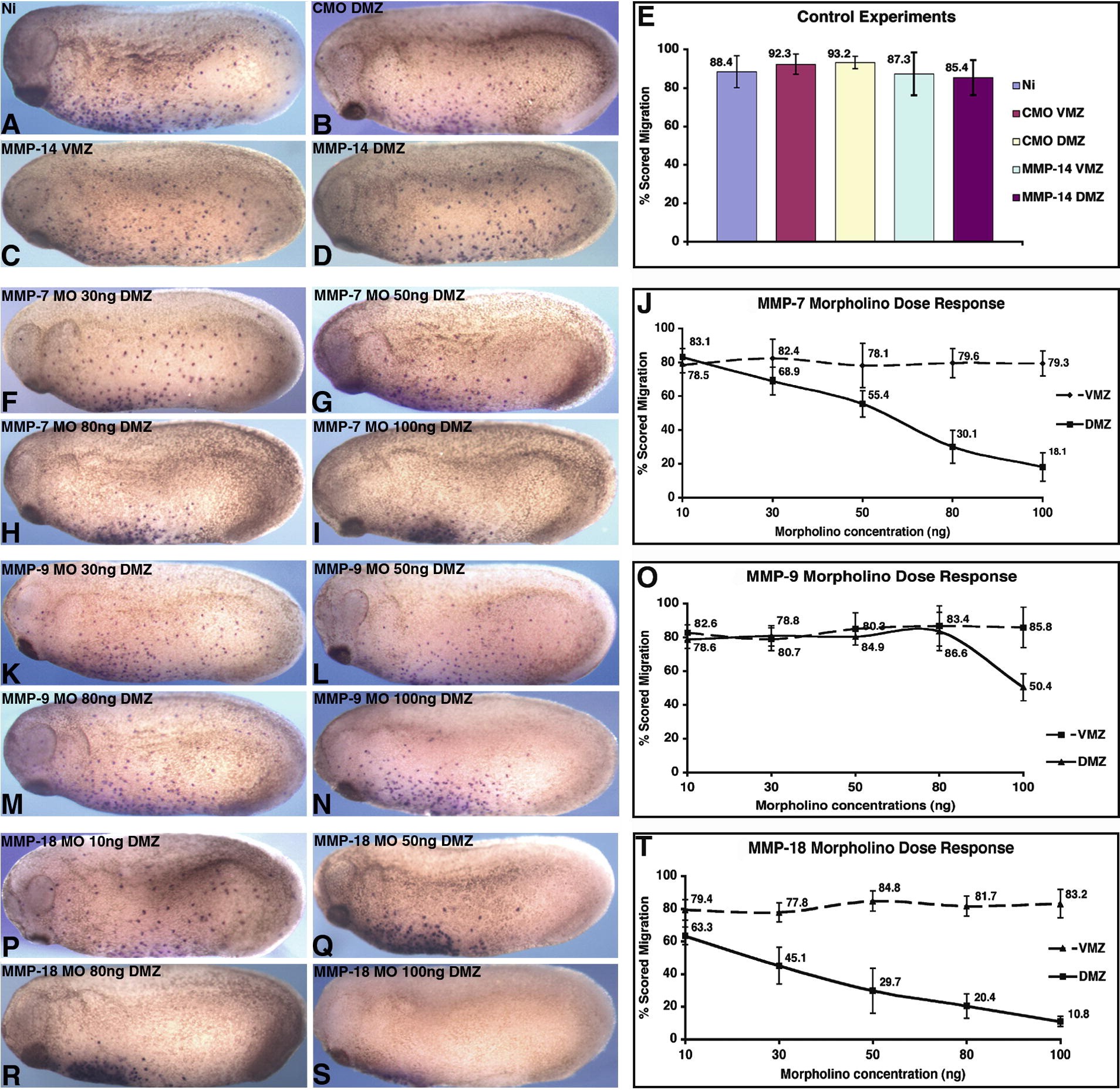Fig. 2. Loss-of-function studies reveal a separate functional contribution for all three MMPs in promoting macrophage migration. (AâE) Control experiments; (A and E) non-injected embryos (Ni), (B and E) control morpholino (CMO) injected embryos at 100Â ng (non-specific scrambled sequence oligonucleotide). (CâE) MMP-14 morpholino (MO) at 100Â ng in both VMZ (C) and DMZ (D), MMP-14 is not expressed in the migrating macrophages. (E) Bar chart showing the effect of morpholino injection on macrophage migration. (FâJ) MMP-7 morpholino DMZ injections (F) 30Â ng, (G) 50Â ng, (H) 80Â ng, (I) 100Â ng; shows a dose-dependent effect on the extent of macrophage migration. (KâO) MMP-9 morpholino injections to both the VMZ and DMZ, (K) 30Â ng, (L) 50Â ng, (M) 80Â ng, (N) 100Â ng. Only with the 100Â ng injection (NÂ +Â O, DMZ) is a partial delay on migration observed. (PâT) MMP-18 morpholino injections to both the VMZ and DMZ, MMP-18 morpholino injections to the DMZ show the strongest effect on macrophage migration, (P) 10Â ng, (Q) 50Â ng, (R) 80Â ng, (S) 100Â ng. All macrophages were visualised by in situ hybridisation with POX2. Graphs illustrate the mean values, with standard deviation plotted on the error bars. All embryos are stage 26 and are shown in lateral view, with anterior to the left.