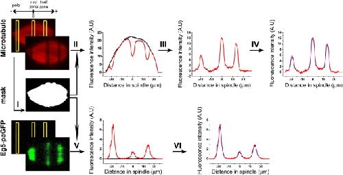 Figure 2. Fluorescence intensity profiles from spindles after photobleaching and photoactivation. Time-lapse videos of a confocal section through spindles containing Cy5 microtubules and photoactivatable Eg5-paGFP were recorded simultaneously in the Cy5 and GFP channel of a confocal fluorescence microscope. Between the first and the second image of a time series, one or several rectangular stripes in the confocal section were bleached and simultaneously photoactivated. To convert the images of the two time series into fluorescence intensity profiles, the area of the spindle in the Cy5 microtubule image before the photobleach was determined by applying an intensity threshold to the image (I). This area served then as a mask for the entire time series of the Cy5 microtubule images and the Eg5-paGFP (illustrated here only for the second frame of the time series). The intensity values were projected onto the spindle axis. This created fluorescence intensity profiles (II and V). The turnover of microtubules and of Eg5 was extracted from time series of these intensity profiles (II and V; see Materials and methods). To determine the exact position of the maximum amount of bleached microtubules, the Cy5 intensity profiles were subtracted from the prebleach profile, resulting in an inverted intensity difference profile (III). The positions of the maximum of the intensity difference profiles of Cy5 microtubules and of the intensity profiles of photoactivated Eg5-paGFP were determined from a Gaussian fit (blue) to the profiles (IV and VI) and used to calculate the velocity of the movements of the peaks (see Materials and methods).