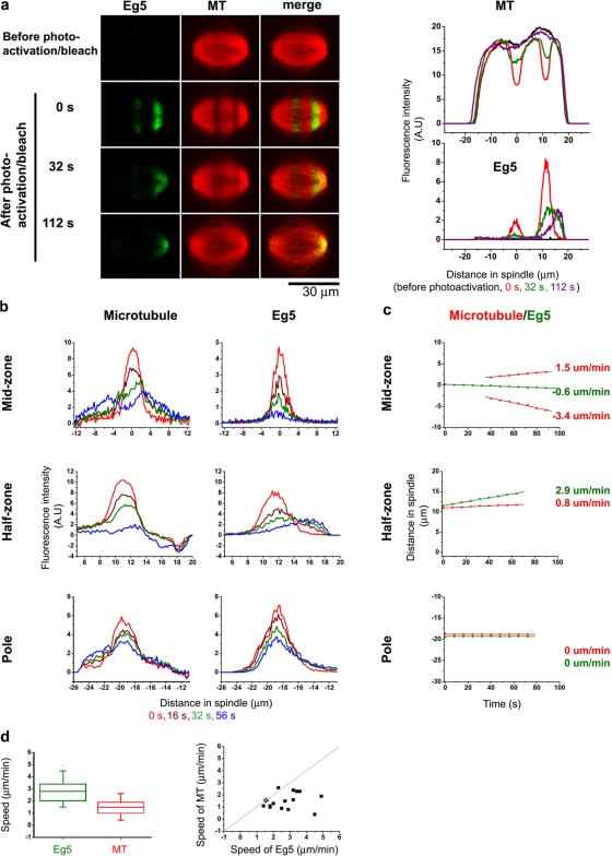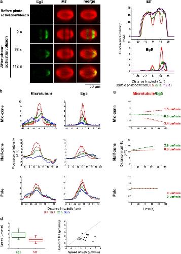 Figure 3. Directed movements of photoactivated Eg5-paGFP and of photobleached Cy5 microtubules along the spindle axis. (a) Spindles in egg extract depleted from endogenous Eg5 and supplemented with Eg5-paGFP and Cy5-tubulin before and after photoactivation of Eg5-paGFP and simultaneous photobleaching of Cy5 microtubules in two different spindle regions. Time series of confocal fluorescence microscopy images of Eg5-paGFP (green) and Cy5 microtubules (MT; red) at the indicated times, and fluorescence intensity profiles (Fig. 2) for Cy5 microtubules and Eg5-paGFP of the same spindle at the indicated times. (b) Intensity difference profiles for bleached Cy5 microtubules and intensity profiles for photoactivated Eg5-paGFP at the indicated times. Only parts of entire profiles are shown for the midzone, halfzone, and pole region. Intensity difference profiles for Cy5 microtubules appear inverted as compared with the intensity profiles (Fig. 2). Note the splitting of the initial single peak of the red microtubule profile in the midzone into two peaks of the blue microtubule profile after 56 s. A corresponding split is not observed in the Eg5 profiles. The intensity profile for the halfzone is derived from the spindle shown in section a, whereas the intensity profiles for the midzone and pole are derived from spindles not shown because of different imaging requirements for the different regions in the spindle. (c) Displacements of the peaks of photoactivated Eg5-paGFP (green) and of photobleached Cy5 microtubules (red) along the spindle axis with time. Linear regression fits (lines) to the experimental values (dots) yielded the velocities as indicated. (d, left) Box plots of the speeds of Eg5 movement (22 measurements in 19 spindles) and of microtubule flux (MT; 16 measurements). (right) Scatter diagram of the speeds of microtubule (MT) flux as a function of the speeds of Eg5 in the halfzone. Each data point represents two simultaneous measurements in the same spindle region.
