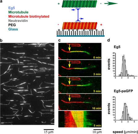 Figure 1. Microtubule pair sliding driven by purified Eg5 in buffer. (a) Schematic of Eg5 within a pair of antiparallel microtubules. The red microtubule is biotinylated and immobilized to a chemically functionalized glass surface via biotin–neutravidin links. The green microtubule is not biotinylated and mobile. (b) Fluorescence microscopy images of Alexa 568 microtubule pairs formed with Eg5-paGFP. Dimly labeled microtubules immobilized on a biotin-PEG glass surface supporting Eg5-mediated binding of brightly labeled microtubules (see Materials and methods). (c) Time series of confocal fluorescence microscopy images of a Cy5-labeled microtubule (green) moved by Eg5 along an immobilized Alexa 568–labeled microtubule (red). Arrows indicate the initial position of the Cy5-labeled microtubule. The bottom panel shows a kymograph of a line along the microtubule pair during the first 5 min of the time series. (d) Histograms showing distributions for speeds of microtubule sliding driven by Eg5 and Eg5-paGFP.