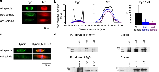 Figure 5. Disruption of the dynein–dynactin complex decreases the amount of Eg5 localizing to spindles in X. laevis egg extract. (a) Confocal fluorescence microscopy images of nonfixed spindles assembled either in the absence or additional presence of p50 or cc1 showing the localization of Eg5. The fluorescence of Eg5-paGFP (green) and of Cy5 microtubules (MT; red) was measured immediately after photoactivation of Eg5-paGFP in the entire spindle. (b) Fluorescence intensity profiles for photoactivated Eg5-paGFP and Cy5 microtubules along the spindle axis for the spindles shown in section a. (right) Mean ratios of the total fluorescence intensity of photoactivated Eg5-paGFP divided by the total fluorescence intensity of Cy5 microtubules (MT) for wild-type spindles, p50 spindles, and cc1 spindles are shown. The means were determined from five spindles per condition. The wild-type intensity ratio was set to 100. Error bars indicate standard deviation. (c) Confocal fluorescence microscopy images of fixed spindles assembled either in the absence (top) or presence (bottom) of cc1 showing the localization of dynein. Dynein heavy chain was detected by immunofluorescence (green), tubulin by using incorporated Alexa 568–tubulin (red), and DNA by Hoechst staining (blue). (d) Western blot analysis showing pull-down of p150Glued with Eg5 on anti-Eg5 beads and pull-down of Eg5 with p150Glued on anti-p150Glued beads in X. laevis egg extract, either in the absence (−cc1) or presence (+cc1) of added p150 fragment cc1. Mock represents magnetic beads coated with an irrelevant antibody also incubated in X. laevis egg extract. An anti-p150Glued antibody was used for detection in the top left three lanes and in the bottom right three lanes, whereas an anti-Eg5 antibody was used for detection in the top right three lanes and in the bottom left three lanes. All samples in a horizontal row were run on the same SDS gel. Molecular weight markers to the left of the blots are in kD.
