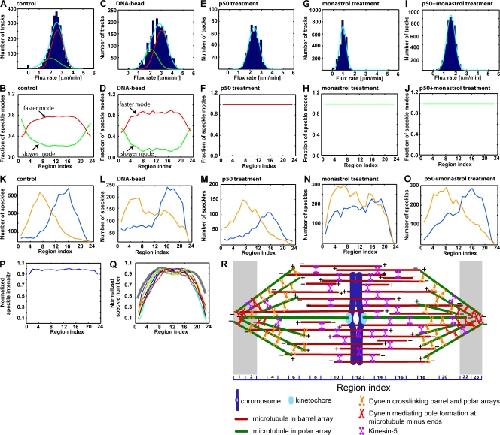 Figure 4. Spatial organization of spindle microtubules. (A, C, E, G, and I) Mode analysis of flux velocity distributions for representative individual spindles: the control spindle in Fig. 1 A (A), the DNA bead spindle in Fig. 2 A (C), the spindle treated with p50/dynamitin in Fig. 3 A (E), the spindle treated with 200 μM monastrol in Fig. 3 C (G), and the spindle treated with 200 μM monastrol and p50/dynamitin in Fig. 3 N (I). Red, fast mode; green, slow mode; cyan, mixture of both modes. (B, D, F, H, and J) Regional contribution of velocity modes. Averages of control spindles (B; N = 11), DNA bead spindles (D; N = 9), p50/dynamitin-treated spindles (F; N = 7), monastrol-treated spindles (H; N = 7), and monastrol and p50/dynamitin–treated spindles (J; N = 6). (K–O) Spatial distribution of speckle appearances of spindles analyzed in A, C, E, G, and I. Orange, speckles moving toward the left pole; blue, speckles moving toward the right pole. (P) Normalized distribution of average speckle intensity (average of 11 control spindles). (Q) Normalized speckle number along the pole-to-pole axis of nine control spindles. Gray, normalized speckle number of a spindle treated with 200 μM monastrol. (R) Model: two slow-fluxing polar microtubule arrays (green) are dynamically coupled via motors to a barrel array (red) with antiparallel microtubule polarity and faster flux velocities. Gray bands representing regions 1–2 and 22–23 define left and right poles in our analysis, respectively.