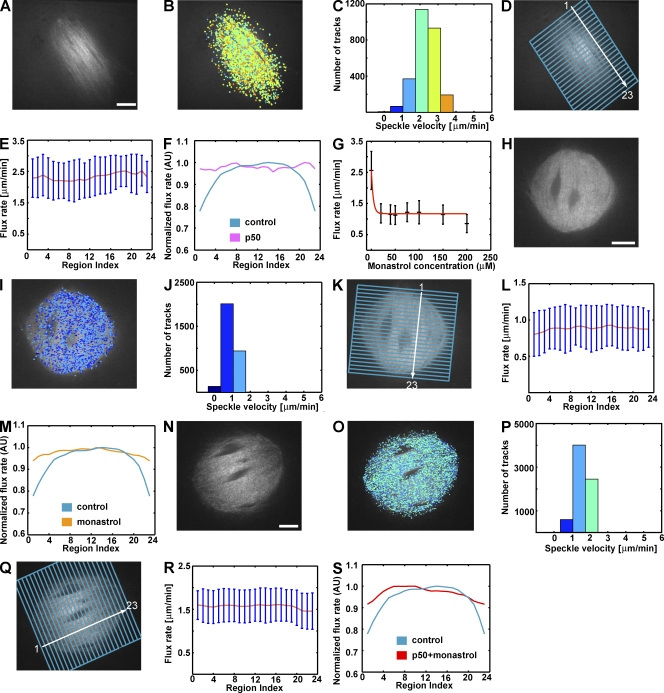 Figure 3. Inhibition of dynein/dynactin, kinesin-5, or both suppresses regional variation of poleward microtubule flux. (A) Spindle treated with excess p50/dynamitin. (B and C) Speckle trajectories color coded according to the velocity histogram (C); the flux rate of the specific spindle shown is mean ± SD = 2.33 ± 0.60 μm/min (N = 2,702 trajectories). (D and E) Mean and SD (error bars) of speckle velocities within regions in D. (F) Normalized flux rate along the pole-to-pole axis of control (average over 11 spindles) versus p50/dynamitin-treated spindles (average over seven spindles). (G) Flux rates at different monastrol concentrations. (H) Spindle treated with 200 μM monastrol. (I and J) Speckle trajectories color coded according to the velocity histogram (J); the flux rate of the spindle shown is mean ± SD = 0.89 ± 0.30 μm/min (N = 3,085 trajectories). (K and L) Mean and SD (error bars) of speckle velocities within regions in K. (M) Normalized flux rate distribution along the pole-to-pole axis of control and monastrol-treated spindles (average over 17 spindles treated with 20–200 μM monastrol). (N) Spindle treated with both 200 μM monastrol and excess p50/dynamitin. (O and P) Speckle trajectories color coded according to the velocity histogram (P); the flux rate of the spindle shown is mean ± SD = 1.59 ± 0.38 μm/min (N = 7,214 trajectories). (Q and R) Mean and SD (error bars) of speckle velocities within regions in Q. (S) Normalized flux rate distribution along the pole-to-pole axis of control versus monastrol + p50/dynamitin–treated spindles (average over six spindles). Bars, 10 μm.