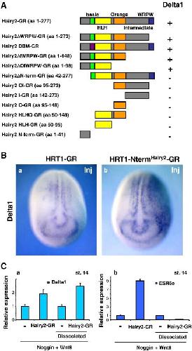 Fig. 3. Identification of Hairy2 domains required for Delta1 induction. (A) Schematic representation of Hairy2-GR wild-type and mutants used. The bHLH, Orange domain and WRPW C-terminal motif are indicated. Embryos injected with 500 pg of mRNA of the indicated inducible constructs were tested at neurula stage by in situ hybridization for Delta1 expression. The activity of the different Hairy2 mutants is indicated (+) for active and (â) for inactive. Note that all mutants containing both the N-terminal portion of the protein and the HLH domain are active. All constructs were tested in a minimum of 20 embryos and the activity described was observed in at least 70% of the embryos. (B) Whole-mount in situ hybridization of neurula embryos injected with 500 pg of HRT1-GR or HRT1-NtermHairy2-GR mRNA and analysed for Delta1 expression. Note that in contrast to wild-type HRT1-GR, HRT1-NtermHairy2-GR induces Delta1. Frequency of embryos: a, none induced, n = 24; b, 85% induced, n = 14. Embryos are viewed from the dorsal side, with the injected side to the right. LacZ mRNA was used as lineage tracer. (C) Q-PCR analysis of Delta1 and ESR6e expression in stage 14 NC induced intact or dissociated animal caps derived from Hairy2-GR mRNA (250 pg/blastomere) injected embryos (â, Hairy2-GR mRNA injected minus DEX). Note that Hairy2-GR activates Delta1 in dissociated NC induced caps (a) and that Esr6e induction, which is observed in intact caps as a consequence of Delta1 induction, is lost in dissociated cells (b), demonstrating the effectiveness of cell dissociation. |