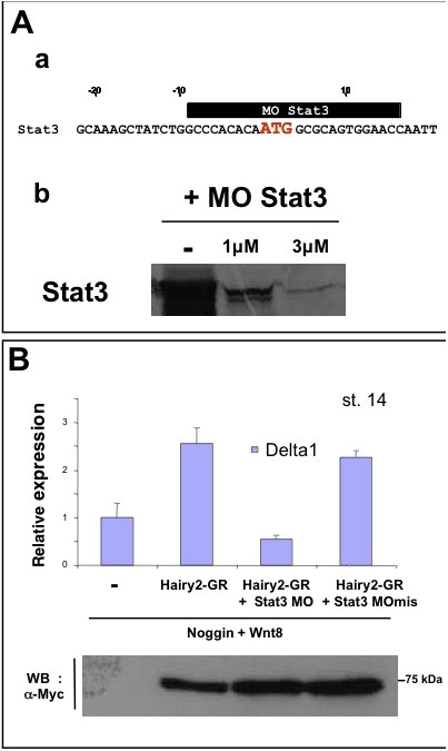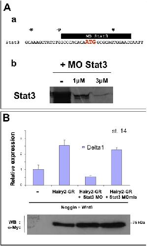 Figure S7. Hairy2-GR is unable to induce Delta1 expression in Stat3 depleted NC induced explants. (A) Stat3 MO (Ohkawara et al., 2004) inhibits the translation of Stat3. In vitro transcription-translation reactions were performed by using the Sp6 Rabbit Reticulocyte Lysate System (Promega) in the presence of 35S methionine. Translation products were analysed by SDS-PAGE/autoradiography. (B) Injection of Stat3 MO (15 ng/blastomere) but not of a control Stat3 MO (Stat3 MOmis, 15ng/blastomere) blocks Hairy2 ability to induce Delta1 in NC induced explants as analysed by Q- PCR. Similar amount of the myc-tagged Hairy2-GR protein was produced in each condition as determined by western blot analysis. |