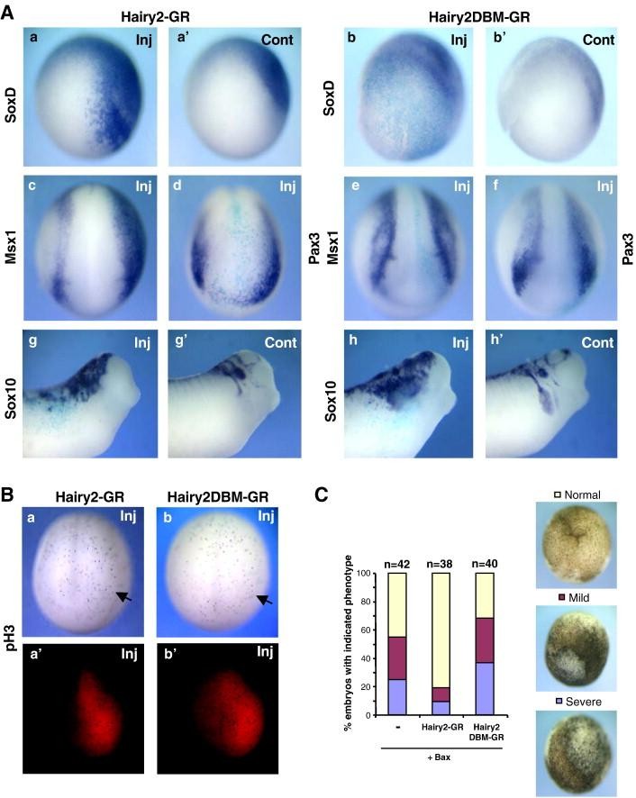 Fig. 1. Hairy2 has DNA-binding dependent and independent activities. (A) Whole-mount in situ hybridization analysis of embryos injected with Hairy2-GR mRNA (500 pg) or Hairy2DBM-GR mRNA (500 pg) and hybridized with the indicated probes. SoxD is ectopically induced and Msx1 and Pax3 expanded by Hairy2-GR but not by Hairy2DBM-GR. In contrast, both Hairy2-GR and Hairy2DBM-GR increase Sox10. Frequency of embryos with the indicated phenotype: a, 89% ectopic, n = 19; b, 100% normal, n = 26; c, 59% expanded, n = 27; d, 65% expanded, n = 32; e, 93% normal, n = 29; f, 72% normal, n = 28; g, 68% expanded, n = 25; h, 57% expanded, n = 22). Lateral views of tailbud embryos (a,b,g,h) with control and injected sides or dorsal views of neurula embryos (câf) with the injected side on the right, anterior to bottom, are shown. LacZ was used as lineage tracer. (B) Both Hairy2-GR and Hairy2DBM-GR overexpression (500 pg mRNA each) increases the number of pH3 positive cells (arrows) (a, 75%, n = 24; b, 47% n = 30). Neurula embryos viewed from the dorsal side, with the injected side on the right are shown. Rhodamine dextran was used as a lineage tracer. (C) Injection of Hairy2-GR mRNA (500 pg), but not Hairy2DBM-GR mRNA (500 pg), rescues Bax (50 pg mRNA) mediated embryonic lethality. The external aspect of the embryos at early gastrula stage was monitored for the presence in the injected area of depigmented enlarged dying cells which are expulsed from the embryo and trapped in between the surface of the embryo and the vitelline membrane. Examples of embryos classified as developing normally (a) or showing a low (b) or a high number of dying cells (c) is shown. The percentage of embryos developing normally or showing a mild or severe phenotype observed in each condition is shown in (c) (â, Hairy2-GR mRNA injected minus DEX). The number of embryos examined is indicated. Embryos were injected at the four cell-stages in the animal pole of one blastomere. Rhodamine dextran was used to identify the injected area (not shown). |