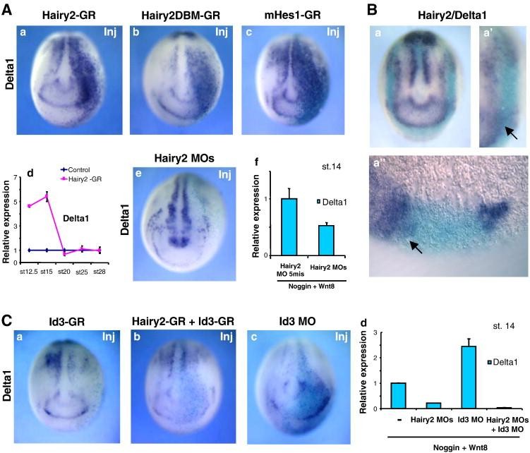 Fig. 2. Hairy2 transiently activates Delta1. (A) Dorsal views of neurula embryos showing Delta1 upregulation upon Hairy2-GR, Hairy2DBM-GR or Hes1-GR injection (500 pg mRNA) (a, 72%, n = 22;b, 83%, n = 36; c, 68%, n = 16, respectively). Q-PCR analysis of Delta1 expression at different time points until tadpole stage in animal caps derived from embryos injected with noggin + Wnt8 overexpressing or not Hairy2-GR mRNA (250 pg/blastomere), with DEX added at the equivalent of stage 12. Note the rapid and transient activation of Delta1 (d). Antero-dorsal view of a late neurula Hairy2 depleted embryo with reduced Delta1 expression in the NC migrating streams (75%, n = 20) (e). Hairy2 MOs (10 ng/blastomere) decreases Delta1 expression in animal caps induced to NC at the equivalent of stage 14 (f). (B) Double in situ hybridization showing that Delta1 (purple) and Hairy2 (light blue) expressions overlap in the anterior portion of the lateral neural plate border (arrows) (a). Higher magnification of the lateral neural plate border (aâ²) and cross section through its anterior portion (aâ²) are shown. (C) Whole-mount in situ hybridization of Delta1 expression in neurula embryos injected with Id3-GR (1 ng), Hairy2-GR (500 pg) and Id3-GR mRNA (1 ng) or Id3 MO (15 ng). Note that Id3 reduces Delta1 (a, 50% inhibited, n = 18) and counteracts Hairy2 activation of Delta1 (b, 73% unaffected, n = 30) while injection of Id3 MO (15 ng) upregulates its expression (c, 60% upregulated, n = 25). Q-PCR analysis of Delta1 expression in NC induced explants derived from embryos injected with Hairy2 MOs (10 ng/blastomere) or Id3 MO (15 ng/blastomere) as indicated (â, uninjected NC induced caps) (d). Note that Id3 depletion upregulates Delta1 and that Hairy2 knockdown and the double knockdown of Id3 and Hairy2 result in Delta1 inhibition. In all in situ panels, neurula embryos are viewed from the dorsal side. LacZ was used to identify the injected side (right side). |