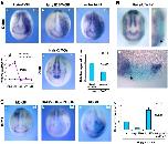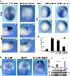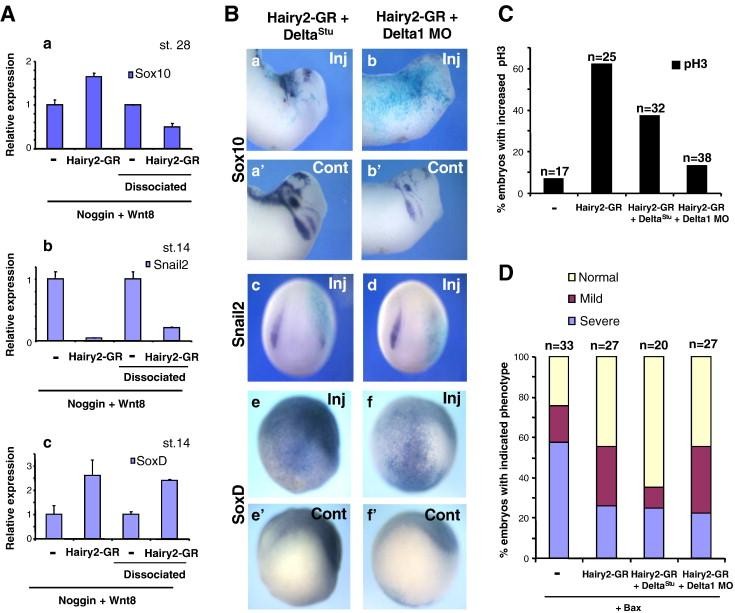 Fig. 4. Hairy2 promotes NC markers and proliferation through Delta1 activation. (A) Q-PCR analysis of Sox10, Snail2 and SoxD expression in NC induced intact or dissociated animal caps derived from Hairy2-GR mRNA (250 pg/blastomere) injected embryos (â, Hairy2-GR mRNA injected minus DEX). Sox10 induction observed upon Hairy2-GR overexpression in intact stage 28 NC induced caps is not observed in dissociated NC induced explants (a). However, repression of Snail2 or induction of SoxD still occurs in dissociated stage 14 NC induced caps (b,c). (B) Whole-mount in situ hybridization of embryos co-injected with Hairy2-GR and Delta1Stu mRNA (1 ng) or Delta1 MO (7.5 ng). Co-injection of Hairy2-GR with Delta1Stu mRNA (1 ng) or Delta1 MO (7.5 ng) affects its ability to induce Sox10 in tailbud embryos, but not its capacity to repress Snail2 or activate SoxD in neurula embryos. Respective repression: (a) 63%, n = 23; (b) 43%, n = 21; (c) 64%, n = 24 and (d) 65%, n = 20. Respective induction: (e) 87%, n = 16 and (f) 60%, n = 28. Lateral views with control and injected sides (a, b, e, f) or dorsal views (c, d) with the injected side on the right are shown. LacZ was used as lineage tracer. (C) Percentage of embryos injected with Hairy2-GR mRNA, Hairy2-GR plus Delta1Stu mRNA (1 ng) or Delta1 MO (7.5 ng) showing increased pH3 staining. Note that co-injection of Delta1Stu mRNA or Delta1 MO blocks Hairy2 ability to promote cell proliferation (â, Hairy2-GR mRNA injected minus DEX). Number of embryos examined is indicated. (D) Percentage of embryos injected as indicated with Bax mRNA (50 pg), Hairy2-GR mRNA (500 pg), Delta1Stu (1 ng) or Delta1 MO (7.5 ng) developing normally or showing a low or high number of dying cells at gastrula stage as shown in Fig. 1C (â, Hairy2-GR mRNA injected minus DEX). Note that Hairy2-GR rescues Bax mRNA mediated embryonic lethality when Notch signaling is blocked. Number of embryos examined is indicated. |