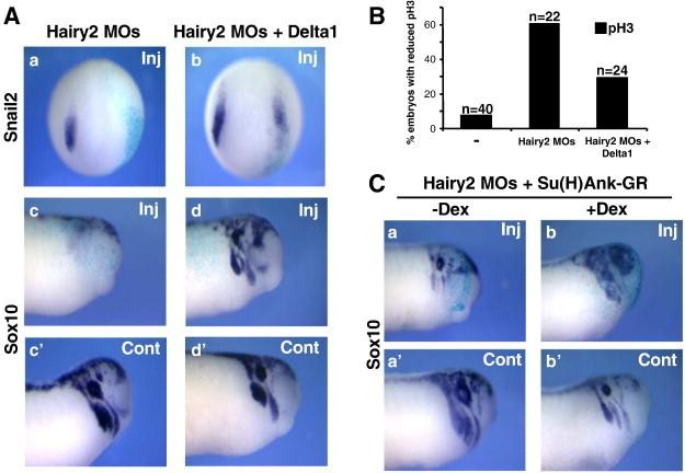 Fig. 5. Rescue of Hairy2 depletion by Delta1. (A) Whole-mount in situ hybridization of embryos injected with Hairy2 MOs (10 ng) alone or with Delta1 mRNA (1 ng) as indicated. Delta1 restores Snail2 (a, b) and Sox10 (c, d) expression in Hairy2 MOs injected embryos. Respective inhibition: (a) 76%, n = 17; (b) 30%, n = 24; (c) 50%, n = 16; (d) 15%, n = 28. Dorsal views of neurula embryos (a, b) with the injected side on the right or lateral views of tailbud embryos (c, d) with control and injected sides revealed by LacZ staining are shown. (B) Percentage of embryos injected with Hairy2 MOs (10 ng) alone or together with Delta1 mRNA (500 pg) showing reduced pH3 staining. Delta1 injection partially rescues the inhibition of proliferation observed in Hairy2 depleted embryos (â, rhodamine dextran injected alone). Number of embryos examined is indicated. (C) Whole-mount in situ hybridization of tailbud embryos injected with Hairy2 MOs (10 ng) with Su(H)Ank-GR mRNA (500 pg). Su(H)Ank-GR efficiently restores Sox10 expression in Hairy2 MOs injected embryos. Rescue of Sox10 is not observed in â DEX control embryos. Respective inhibition: a, 77% n = 18; b, 42% n = 21. Lateral views with control and injected sides identified by LacZ staining are shown. |