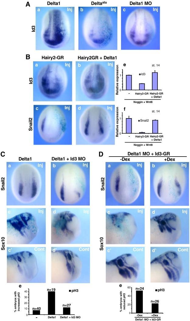 Fig. 6. Id3 is required for NC development downstream of Delta1. (A) Whole-mount in situ analysis of embryos injected with Delta1 mRNA (1 ng), DeltaStu mRNA (1 ng) or Delta1 MO (7.5 ng) as indicated. Note that Delta1 overexpression increases Id3 (a, 50% induced, n = 16). Conversely, Id3 is reduced in Delta1Stu mRNA or Delta1 MO injected embryos (b, 55%, n = 24; c, 67%, n = 18). (B) Activation of Notch signaling by injection of Delta1 mRNA (1 ng) rescues Id3 and Snail2 inhibition by Hairy2-GR in neurula embryos (a, 60% reduced, n = 23; b, 93% rescued, n = 15; c, 78% inhibited n = 18; d, 67% rescued, n = 30). Q-PCR analysis of Id3 (e) and Snail2 (f) expression in NC induced explants derived from embryos injected with Hairy2-GR mRNA (250 pg/blastomere) with or without Delta1 mRNA (500 pg/blastomere) as indicated (â, uninjected NC induced caps). Note that co-injection of Delta1 mRNA rescues Id3 and Snail2 repression by Hairy2-GR. (C) Id3 MO (15 ng) blocks Delta1 (1 ng mRNA, aâd; 500 pg mRNA, e) induction of Snail2, Sox10 and cell proliferation in embryos. Percentage of embryos with the indicated phenotype: a, 55% increased, n = 20; b, 70% inhibited, n = 26; c, 68%, increased n = 19; d, 62% reduced, n = 33. Percentage of embryos injected with Delta1 mRNA (500 pg) with or without Id3 MO (15 ng) showing increased pH3 staining (e). Note that co-injection of Id3 MO reduced Delta1 ability to stimulate cell proliferation (â, rhodamine dextran injected alone). Number of embryos examined is indicated. (D) Id3-GR mRNA (1 ng) injection partially rescues Snail2 in Delta1 (7.5 ng) depleted neurula embryos and Sox10 at tailbud stage but not in â DEX control embryos. Respective inhibition and rescue: a, 87% inhibited, n = 30; b, 70% unaffected, n = 37; c, 62% inhibited, n = 16; d, 67% unaffected, n = 21. Percentage of embryos injected with Delta1 MO (7.5 ng) with Id3-GR mRNA (1 ng) showing decreased pH3 staining (e). Note that Id3 partially rescues the inhibition of cell proliferation observed in Delta1 MO injected embryos. Number of embryos examined is indicated. In all panels, neurula embryos are viewed from the dorsal side, with the injected side revealed by LacZ staining oriented to the right. Tailbud embryos are viewed from the lateral side. Control and injected sides are shown. |