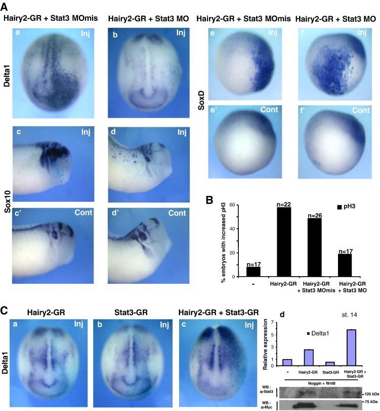 Fig. 7. Stat3 is necessary for Hairy2 non-cell-autonomous function. (A) Whole-mount in situ hybridization of embryos injected with Hairy2-GR mRNA (500 pg), Stat3 MOmis (15 ng) or Stat3 MO (15 ng) as indicated. Note that injection of Stat3 MO blocks Hairy2 ability to induce Delta1 (a, 70% induced, n = 22; b, 20%, induced, n = 20) and to upregulate Sox10 (c, 55% increased, n = 30; d, 12% increased, n = 26) but not its ability to induce SoxD (e, 90% increased, n = 20; f, 82% increased, n = 22). Dorso-anterior views of neurula embryos (a,b) with the injected side on the right or lateral views of embryos (câf) with control and injected sides are shown. LacZ mRNA was co-injected as a lineage tracer to identify the injected side. (B) Percentage of embryos injected with Hairy2-GR mRNA (500 pg), Stat3 MO7mis (15 ng) or Stat3 MO (15 ng) as indicated showing increased pH3 staining. Note that the co-injection of the Stat3 MO reduces Hairy2 ability to stimulate cell proliferation (â, Hairy2-GR mRNA injected minus DEX). Number of embryos examined is indicated. (C) Whole-mount in situ hybridization of embryos injected with Hairy2-GR (150 pg) or Stat3-GR (500 pg) mRNA as indicated. Note that Hairy2-GR or Stat3-GR mRNA injection has no effect on Delta1 expression (a, none affected n = 12; b, 0%, n = 15). When combined, Delta1 is however strongly upregulated (c, 71% induced, n = 21). Hairy2-GR (50 pg/blastomere) with Stat3-GR (250 pg/blastomere) also strongly increases Delta1 in NC induced animal caps. The amount of myc-tagged Hairy2-GR and Stat3-GR proteins detected using anti-myc and anti-Stat3 proteins produced in each condition is shown (d). Dorsal views of neurula embryos with the injected side on the right are shown. LacZ was co-injected to reveal the injected side. |