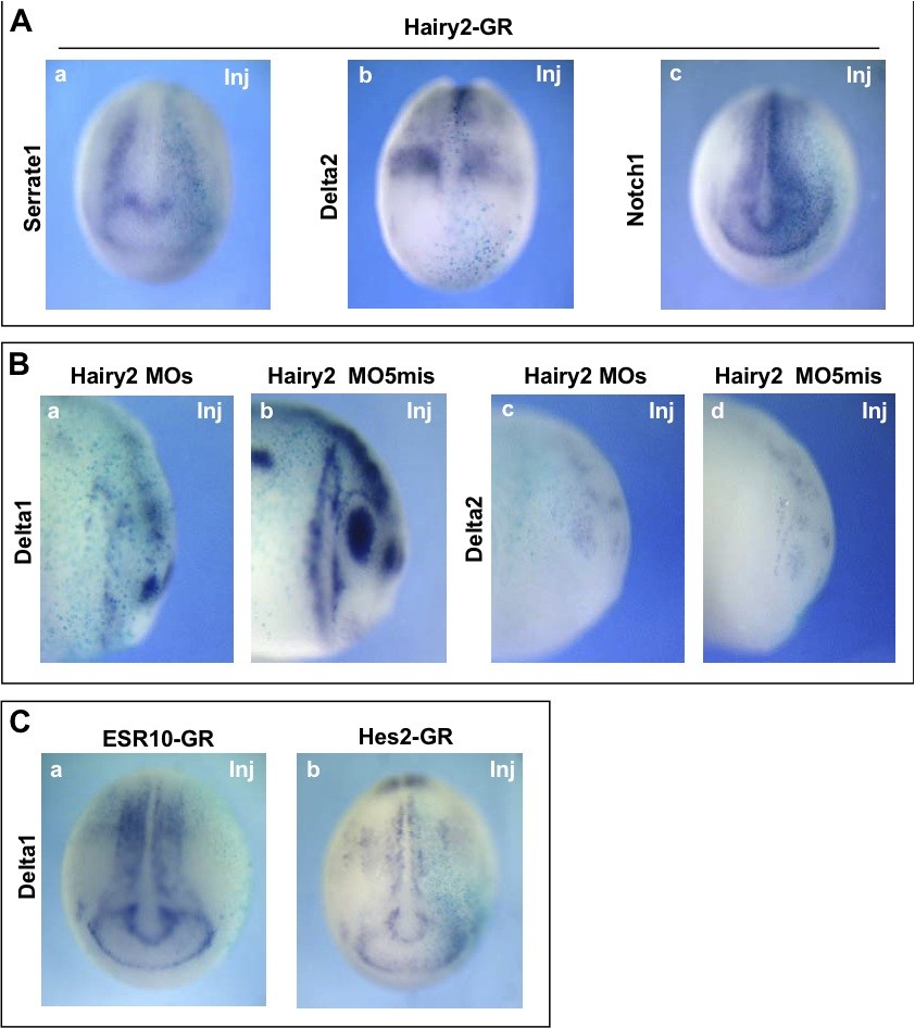 Figure S2. Hairy2, Hes2 and ESR10 effects on Notch pathway genes. A) Hairy2-GR mRNA (500 pg) injection is unable to induce the expression of the Notch ligands Serrate1 (a), Delta2 (b) or the Notch receptor (c) in neurula embryos (none induced, n = 16, 18 and 15, respectively). B) Injection of the Hairy 2 MOs (10 ng) leads to decreased Delta1 expression in the migrating NC and in the eye at tailbud stages (a, 75% reduced, n = 20) while injection of a Hairy2 MO5mis has no effect (b, 75% unaffected, n = 16). Injection of either the Hairy2 MOs, like Hairy2 MO5mis, has no effect on Delta2 in tailbud embryos (c, 70% unaffected, n = 25; d, 86%, n = 14). (C) Injection of ESR10- GR or Hes2-GR mRNA (500 pg each) does not affect Delta1 expression (none induced n = 13 and 15, respectively). In all panels, embryos at neurula stage are shown in dorsal view. In the case of embryos at tailbud stage, lateral views of the injected sides are shown. LacZ mRNA was coinjected as a lineage tracer. |