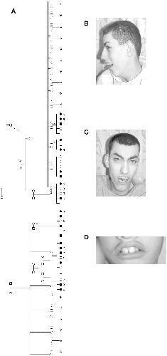 (D) Prominent incisor teeth of young affected individual.